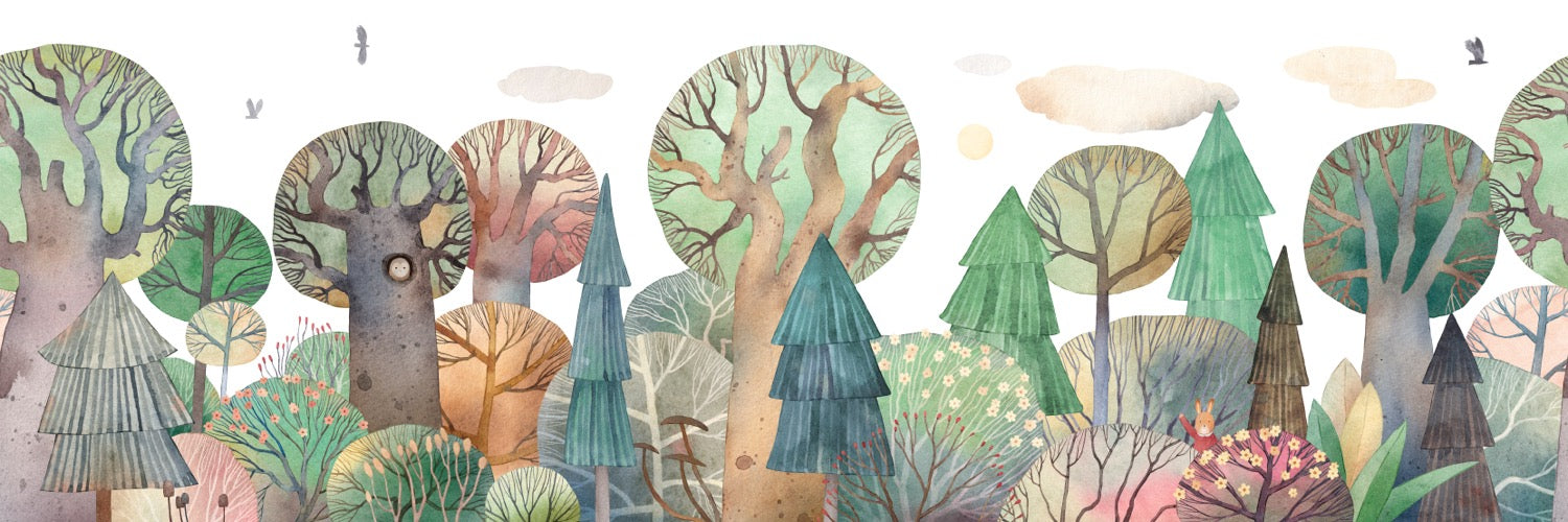 Wander through a charming Storybook Woods with this Illustrated Forest wall feature. Unique, stylized trees rendered in soft watercolor tones of green, brown, and blue create a gentle, imaginative landscape. Ideal for sparking wonder in a children's room or adding a touch of nature's calm to a nursery.