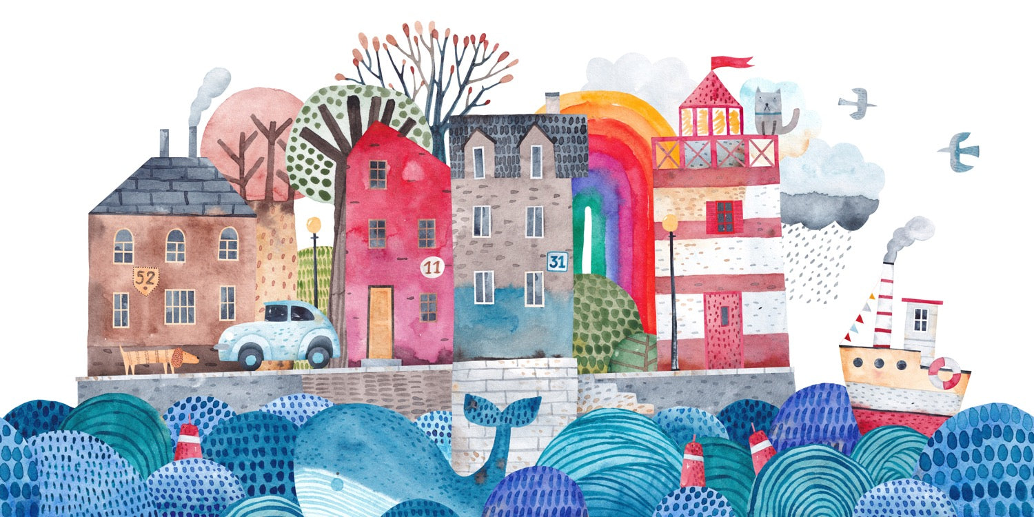 Capture the playful spirit of the coast with this charming watercolor village scene. Whimsical houses, a friendly whale, and a bright lighthouse create a narrative that sparks imagination. Perfect for adding cheerful character to a nursery or children's room.