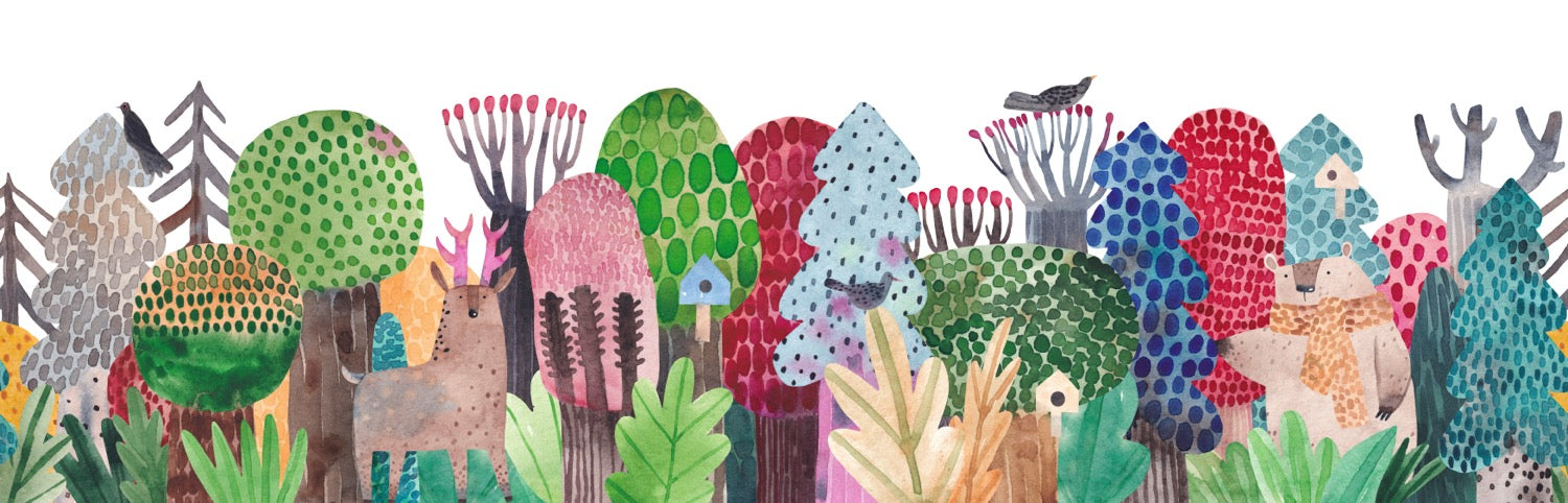 Step into a playful woodland with this charming watercolor forest scene. Colorful, stylized trees house friendly deer, bears, and birds, creating an imaginative and vibrant atmosphere. Perfect for adding a touch of wonder to a children's room, nursery, or playroom wall.
