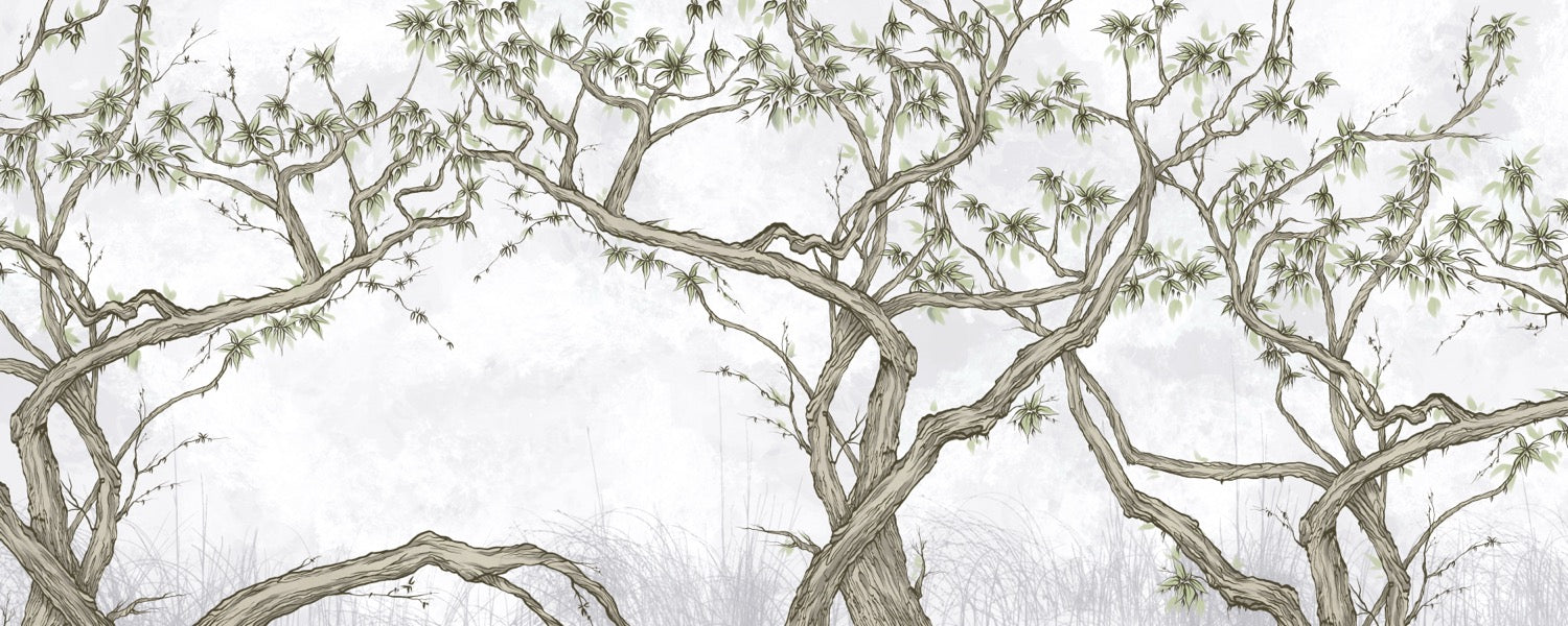 Embrace nature's artistry with this captivating wall covering featuring elegantly intertwined branches. The soft green leaves and beige limbs stand out against a subtle, misty white backdrop, lending a modern yet organic feel. Ideal for adding a touch of sophisticated tranquility to a living room, bedroom, or hallway.