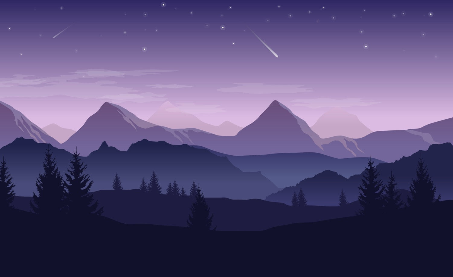 A mesmerizing landscape featuring layered mountain silhouettes against a dreamy purple twilight sky adorned with shooting stars. Pine forests frame the foreground while ethereal peaks fade into the distance, creating a sense of depth and tranquility that transforms any space into a peaceful sanctuary.